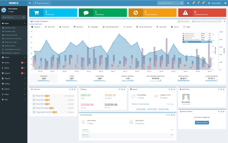 Even people without coding or technical knowledge can handle the WHMC dashboard easily. It is almost like you login to your WordPress admin dashboard. In the dashboard, you have the complete overview of the orders, requests and the pending tickets to be answered.